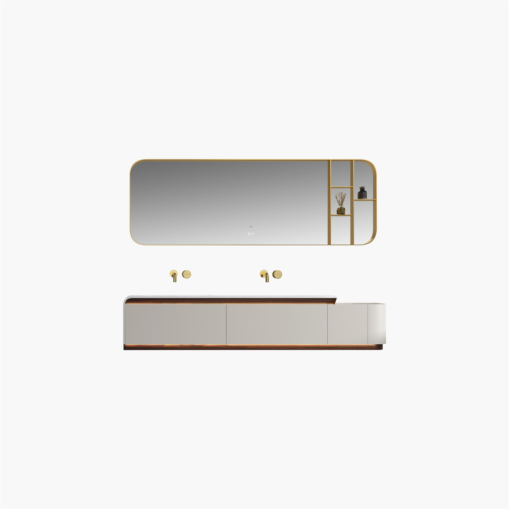 The ITAVA CRYSTAL Series TV-CRY22 captures the quiet elegance of modern living, blending soft light, refined textures, and natural warmth. This luxurious bathroom set features a customized 2185mm cabinet in gloss milk apricot pear and black walnut tones, crafted from solid wood and multi-layer walnut for lasting durability. Equipped with Hettich 14-inch buffer rails, three drawers with aluminum side panels, a U-shaped groove, and a bottom induction light, the cabinet offers functional storage with a seamless user experience. The one-piece pure white Corian curved basin has a smooth and elastic surface, featuring both sculptural beauty and easy maintenance. In addition, the 2100mm LED mirror features a brushed gold stainless steel frame and shelves, equipped with a 4000K backlight, anti-fog system and an inductive touch switch, combining elegance and convenience. TV-CRY22 is a statement bathroom solution that heals the spirit while elevating contemporary interiors.