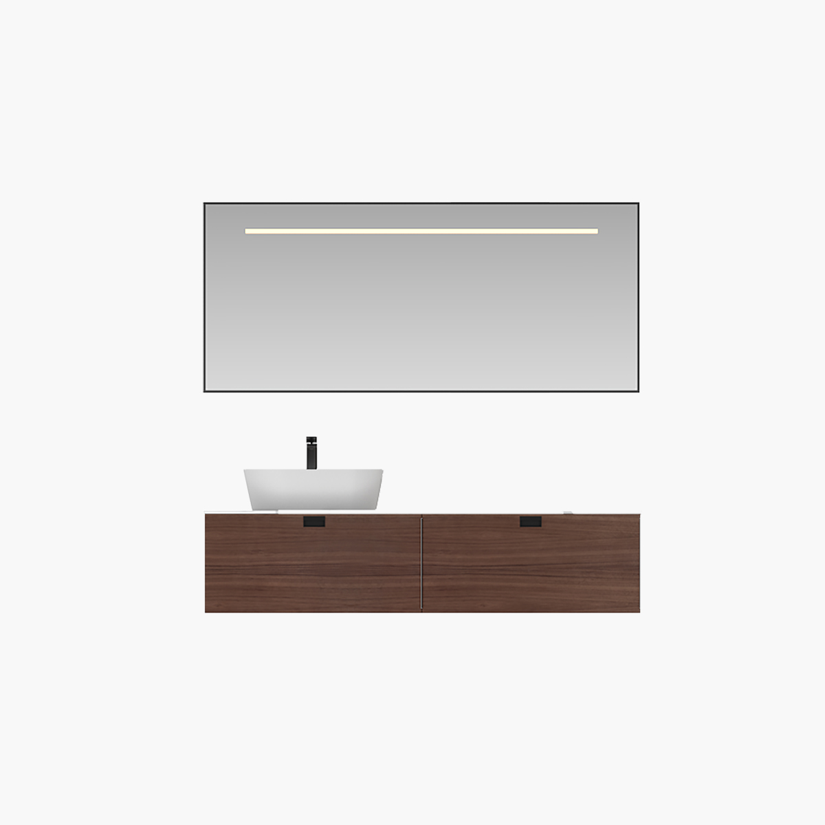 The ALBERT Series TV-ALB15 reflects the collection’s signature balance of formal lightness, comfort, and striking personality. Designed with a walnut-colored cabinet crafted from 18mm paint-free plywood, it features two smooth Unihopper rail drawers that offer both durability and refined storage. The TCB-07A ceramic basin in glossy white is perfectly integrated atop a fish belly white quartz stone countertop, combining modern aesthetics with strength and easy maintenance. This 1500mm matte black LED mirror is more powerful, featuring a 5mm copper-free eco-friendly silver mirror and a durable stainless steel frame. It offers adjustable LED lighting (3000K/4000K/6000K), anti-fog function and seamless switchable touch-sensitive switches. TV-ALB15, with its exquisite detail design and unique tilted design language, adds a modern and refined touch to any bathroom.