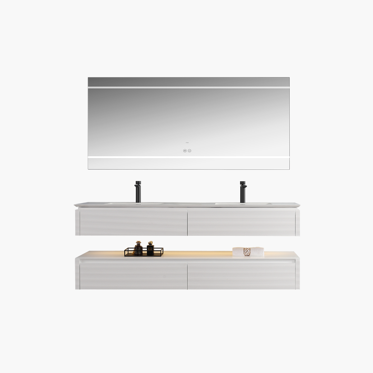 The MATILDA Series TV-MAT18 reflects timeless simplicity with its clean square design and refined functionality. The upper cabinet (1798mm) is crafted from white painted plywood, featuring two spacious drawers with Unihopper 120mm high LED glass panels. Horizontal Roman lines on the drawer fronts enhance its elegant detail, while motion-sensor lights beneath the cabinet add a modern touch of convenience. To complement this, the lower cabinet (1798 mm) features two additional drawers, each equipped with 80mm LED glass on both sides, providing both aesthetic and practical storage functions. The double high-gloss white ceramic under-sink (540 mm) is elegantly placed on the durable white quartz countertop (1800 mm), which is smooth and elastic. In addition, there is a frameless LED mirror (1750mm), with matte light strips on both the top and bottom, featuring anti-fog technology and equipped with sensitive touch-sensitive switches. Designed for contemporary bathrooms, the TV-MAT18 blends minimalism, modern technology, and everyday functionality into a truly elegant statement piece.