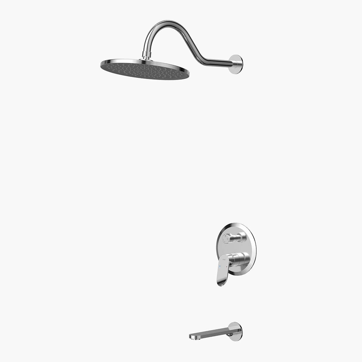 The TF-ARO3702 boasts a premium brass body and sleek chrome finish, blending style and functionality. Its curved shower arm complements a round overhead shower and practical spout, achieving a harmonious balance of beauty and utility. This versatile and stylish combination is perfect for modern bathrooms, offering a sophisticated look with efficient performance.