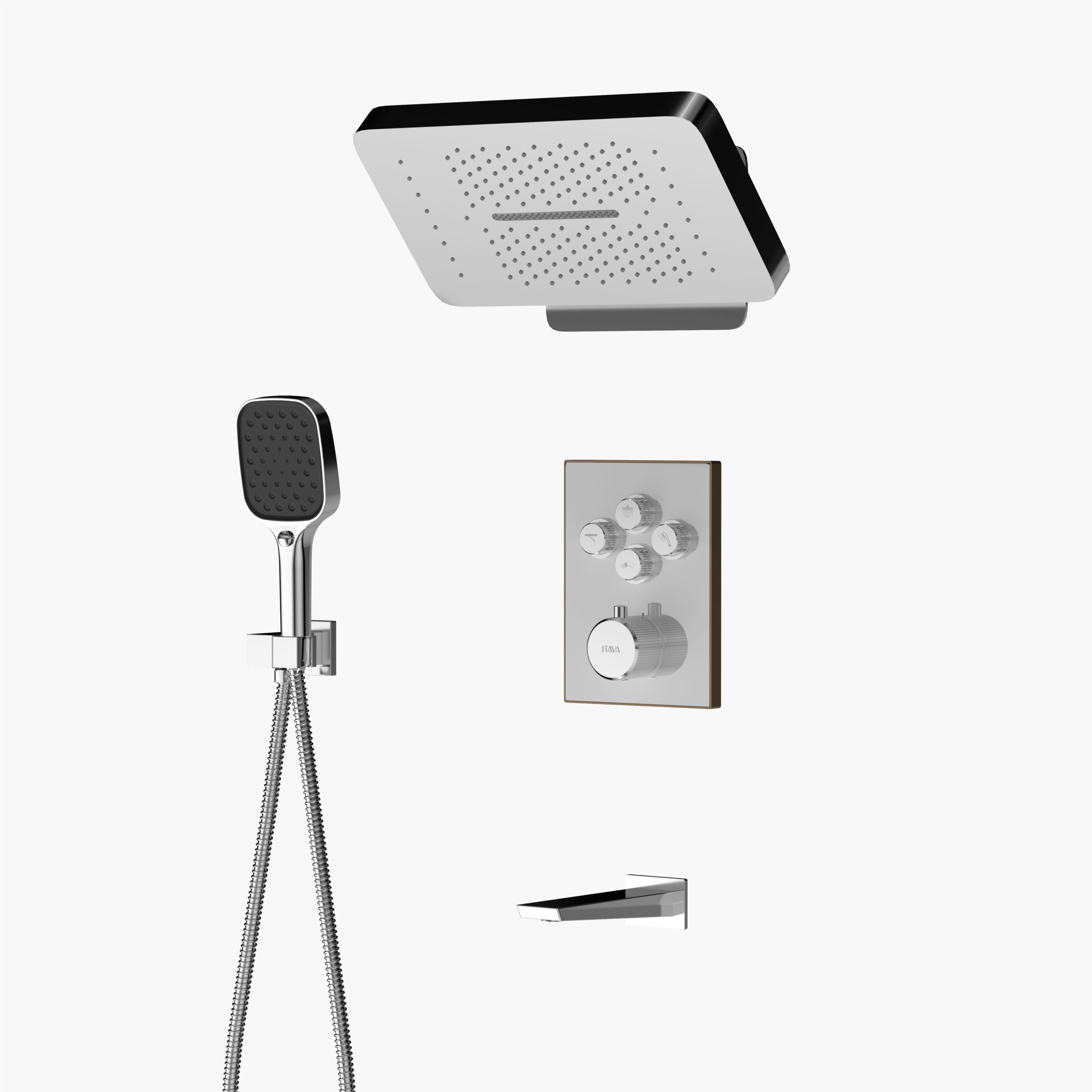 The ITAVA JETT series perfectly blends modern aesthetics with precise water flow control. Designed for users who demand superior performance and visual harmony. The TF-JET97403 is a four-function thermostatic concealed shower and bathtub faucet that delivers a complete shower experience. Crafted from solid brass and a chrome finish, it integrates four different functions: a s.s waterfall shower head (with two spray modes), an ABS hand showerhead, and a spout. Its Wanhai thermostatic cartridge ensures water temperature, preventing sudden changes in water pressure or temperature, while providing comfort and safety. The instant shower a concealed mounting box, creating a minimalist wall finish, enhancing the aesthetics of the space, and simplifying maintenance. A 150cm stainless steel hose allows for flexible operation, and a precisely designed manifold ensures smooth function switching. The best high pressure shower head combines timeless design with intelligent thermostatic control, representing efficiency, comfort, and modern elegance within the JETT series.