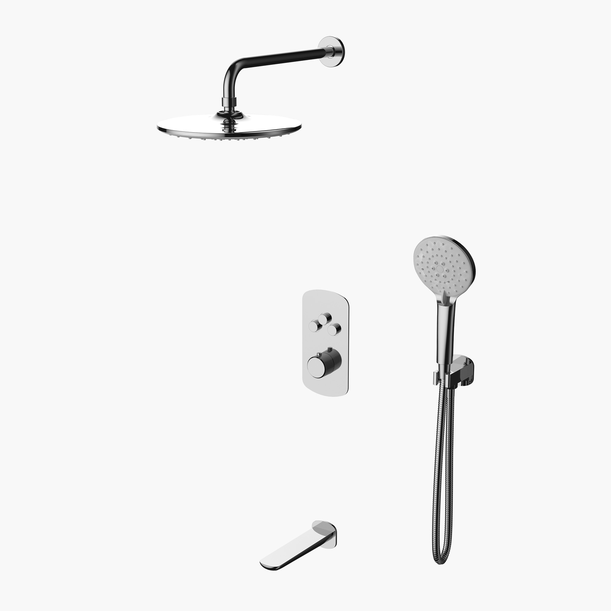 The TF-LOR6730 offers three independent water flow functions – an immersive top spray shower, a smooth-flowing bathtub faucet, and a flexible handheld shower – each function is controlled by a separate button. This intuitive three-button switching design enables users to easily select the desired function. The top spray shower and handheld shower made of ABS material provide uniform water flow, offering a relaxing and efficient shower experience. The 1.5-meter-long 304 stainless steel hose ensures flexibility and convenience in use.